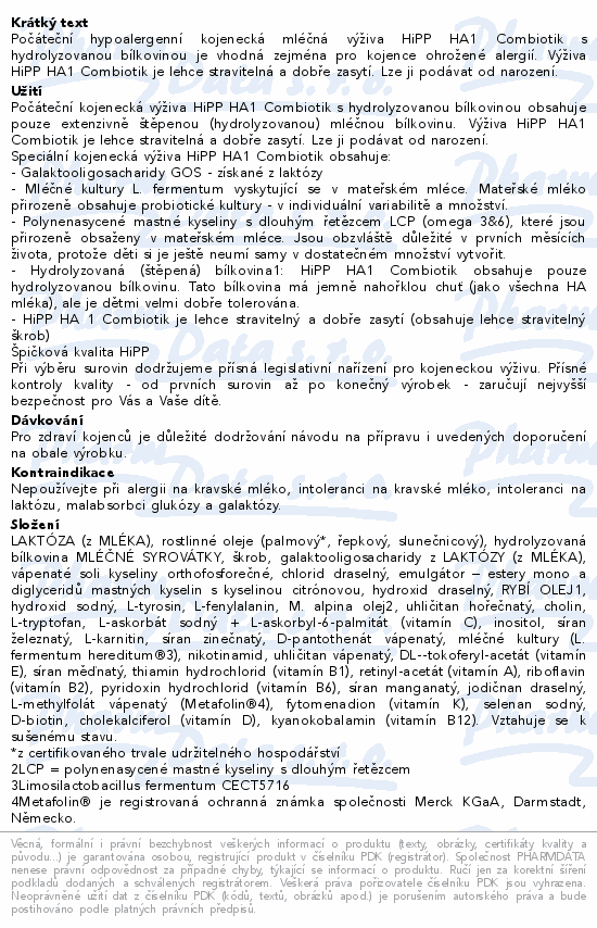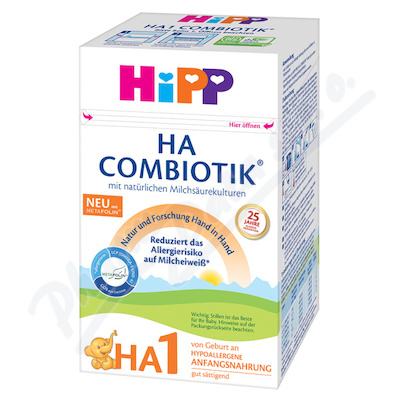 Počáteční hypoalergenní kojenecká mléčná výživa HiPP HA1 Combiotik s hydrolyzovanou bílkovinou je vhodná zejména pro kojence ohrožené alergií. Výživa HiPP HA1 Combiotik je lehce stravitelná a dobře zasytí. Lze ji podávat od narození.