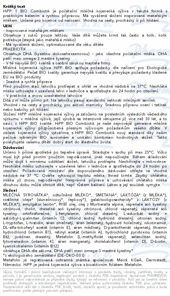 HiPP 1 BIO Combiotik je počáteční mléčná kojenecká výživa v tekuté formě s praktickým balením a rychlou přípravou. Má vyvážené složení inspirované mateřským mlékem. Určená pro kojence od narození. Vhodná na cesty, procházky či při hlídání.