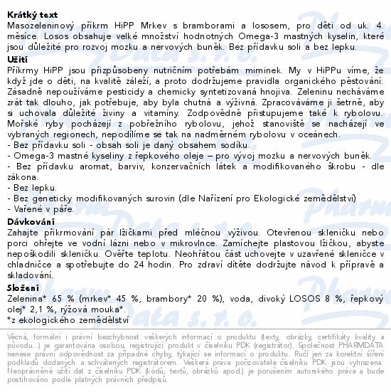 Masozeleninový příkrm HiPP Mrkev s bramborami a lososem, pro děti od uk. 4. měsíce. Losos obsahuje velké množství hodnotných Omega-3 mastných kyselin, které jsou důležité pro rozvoj mozku a nervových buněk. Bez přídavku soli a bez lepku.