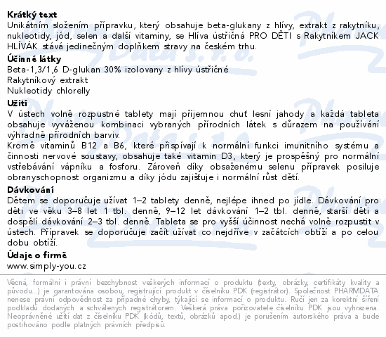 Unikátním složením přípravku, který obsahuje beta-glukany z hlívy, extrakt z rakytníku, nukleotidy, jód, selen a další vitaminy, se Hlíva ústřičná PRO DĚTI s Rakytníkem JACK HLÍVÁK stává jedinečným doplňkem stravy na českém trhu.