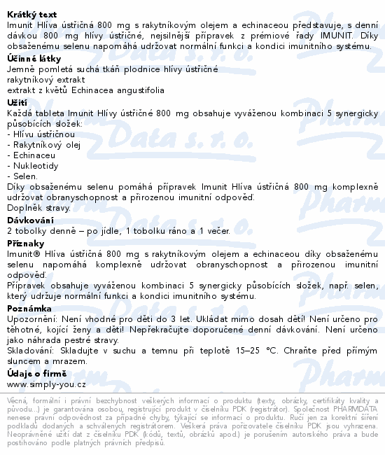 Imunit Hlíva ústřičná 800 mg s rakytníkovým olejem a echinaceou představuje, s denní dávkou 800 mg hlívy ústřičné, nejsilnější přípravek z prémiové řady IMUNIT. Díky obsaženému selenu napomáhá udržovat normální funkci a kondici imunitního systému.
