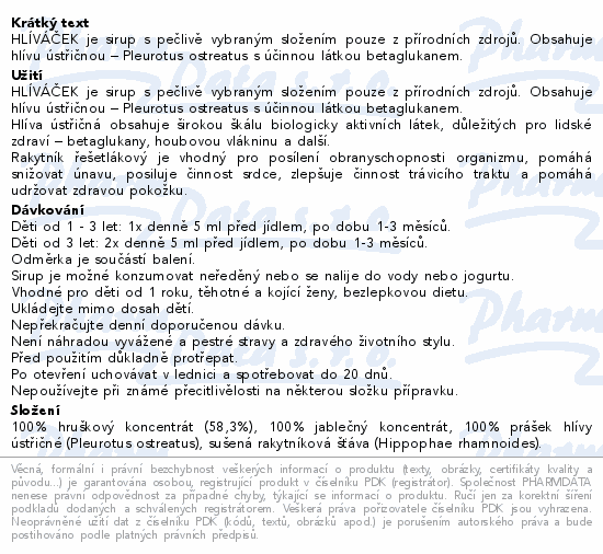 Ovocný sirup s hlívou ústřičnou a rakytníkem pro podporu imunity dětí už od 1 roku (posouzeno Českou pediatrickou společností). Hlíváček v sobě kombinuje naše dvě nejoblíbenější stálice – hlívu a rakytník. Opět jsme použili celou pomletou hlívu se všemi bioaktivními látkami, které v sobě přirozeně obsahuje, a obohatili ji o rakytníkovou šťávu, to vše zalité v neodolatelném ovocném sirupu s hruškovou chutí. Nenajdete v něm žádné konzervanty, barviva, ani umělá sladidla. S hrdostí můžeme říct, že na každou jednu lahvičku sirupu padl více než 1 kg čerstvého ovoce. Hlíváčka tak tvoří jen přírodní suroviny pro rozzářené oči našich nejmenších.
