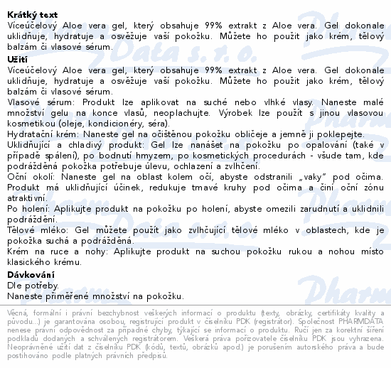 Víceúčelový Aloe vera gel, který obsahuje 99% extrakt z Aloe vera. Gel dokonale uklidňuje, hydratuje a osvěžuje vaší pokožku. Můžete ho použit jako krém, tělový balzám či vlasové sérum.