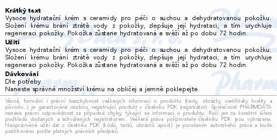Vysoce hydratační krém s ceramidy pro péči o suchou a dehydratovanou pokožku. Složení krému brání ztrátě vody z pokožky, zlepšuje její hydrataci, a tím urychluje regeneraci pokožky. Pokožka zůstane hydratovaná a svěží až po dobu 72 hodin.