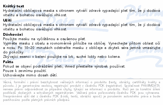 Hydratační obličejová maska s citronem vytváří zdravě vypadající pleť tím, že jí dodává vitalitu a bohatou osvěžující vlhkost.