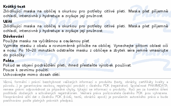 Zklidňující maska na obličej s okurkou pro potřeby citlivé pleti. Maska pleť příjemně ochladí, intenzivně ji hydratuje a zvyšuje její pružnost.