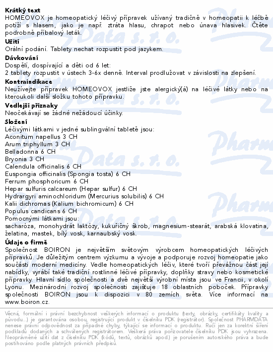Z důvodu možného rizika vdechnutí tablet se přípravek HOMEOVOX nemá používat u dětí ve věku do 6 let. Bez porady s lékařem neužívejte tento přípravek déle než 6 dní. Pokud nedojde ke zlepšení obtíží do 2 dnů, poraďte se se svým lékařem.