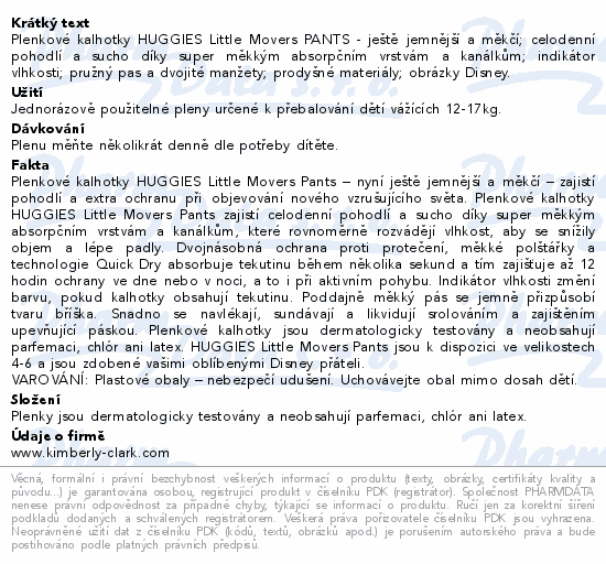 Plenkové kalhotky HUGGIES Little Movers PANTS - ještě jemnější a měkčí; celodenní pohodlí a sucho díky super měkkým absorpčním vrstvám a kanálkům; indikátor vlhkosti; pružný pas a dvojité manžety; prodyšné materiály; obrázky Disney.