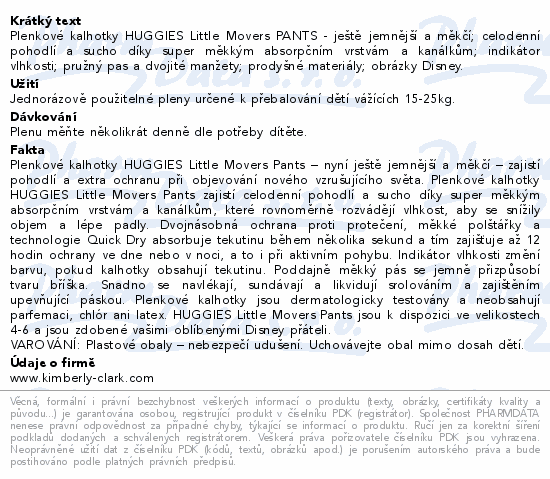 Plenkové kalhotky HUGGIES Little Movers PANTS - ještě jemnější a měkčí; celodenní pohodlí a sucho díky super měkkým absorpčním vrstvám a kanálkům; indikátor vlhkosti; pružný pas a dvojité manžety; prodyšné materiály; obrázky Disney.