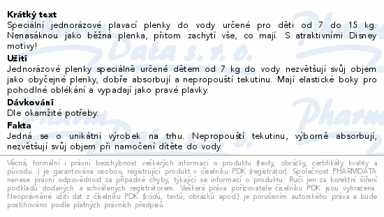 Speciální jednorázové plavací plenky do vody určené pro děti od 7 do 15 kg. Nenasáknou jako běžná plenka, přitom zachytí vše, co mají. S atraktivními Disney motivy!