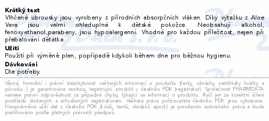 Vlhčené ubrousky jsou vyrobeny z přírodních absorpčních vláken. Díky výtažku z Aloe Vera jsou velmi ohleduplné k dětské pokožce. Neobsahují alkohol, fenoxyethanol, parabeny, jsou hypoalergenní. Vhodné pro každou příležitost, nejen při přebalování dětí.
