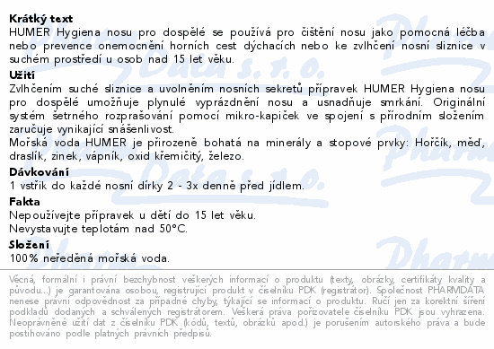 HUMER Hygiena nosu pro dospělé se používá pro čištění nosu jako pomocná léčba nebo prevence onemocnění horních cest dýchacích nebo ke zvlhčení nosní sliznice v suchém prostředí u osob nad 15 let věku.