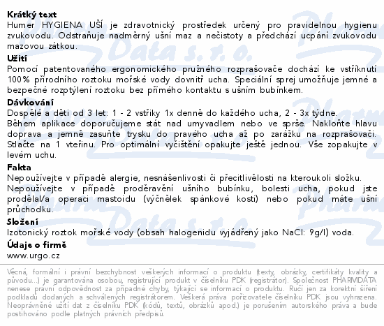 Humer HYGIENA UŠÍ je zdravotnický prostředek určený pro pravidelnou hygienu zvukovodu. Odstraňuje nadměrný ušní maz a nečistoty a předchází ucpání zvukovodu mazovou zátkou.