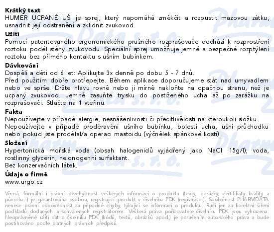 HUMER UCPANÉ UŠI je sprej, který napomáhá změkčit a rozpustit mazovou zátku, usnadnit její odstranění a zklidnit zvukovod.