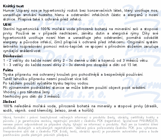 Humer Ucpaný nos je hypertonický roztok bez konzervačních látek, který uvolňuje nos, usnadňuje smrkání hustého hlenu a odstranění infekčních částic a alergenů z nosní sliznice. Přispívá také k ochraně před infekcí.