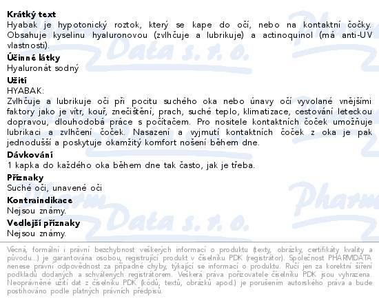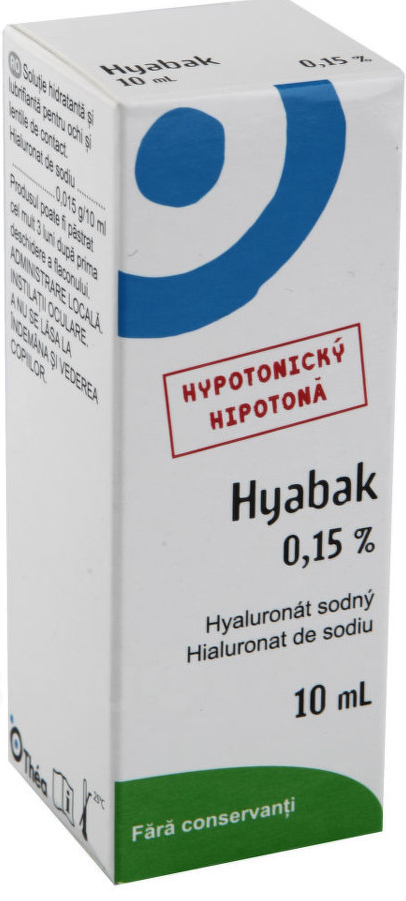Hyabak je hypotonický roztok, který se kape do očí, nebo na kontaktní čočky. Obsahuje kyselinu hyaluronovou (zvlhčuje a lubrikuje) a actinoquinol (má anti-UV vlastnosti).