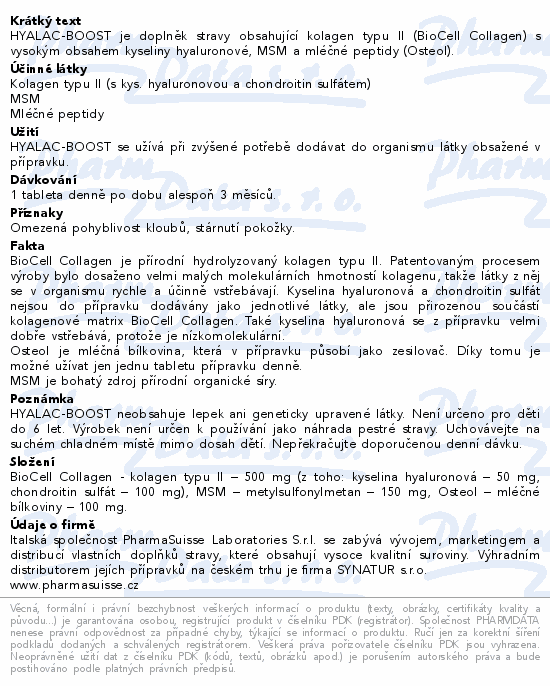 HYALAC-BOOST je doplněk stravy obsahující kolagen typu II (BioCell Collagen) s vysokým obsahem kyseliny hyaluronové, MSM a mléčné peptidy (Osteol).