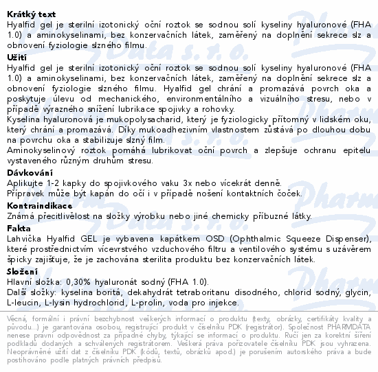 Hyalfid gel je sterilní izotonický oční roztok se sodnou solí kyseliny hyaluronové (FHA 1.0) a aminokyselinami, bez konzervačních látek, zaměřený na doplnění sekrece slz a obnovení fyziologie slzného filmu.