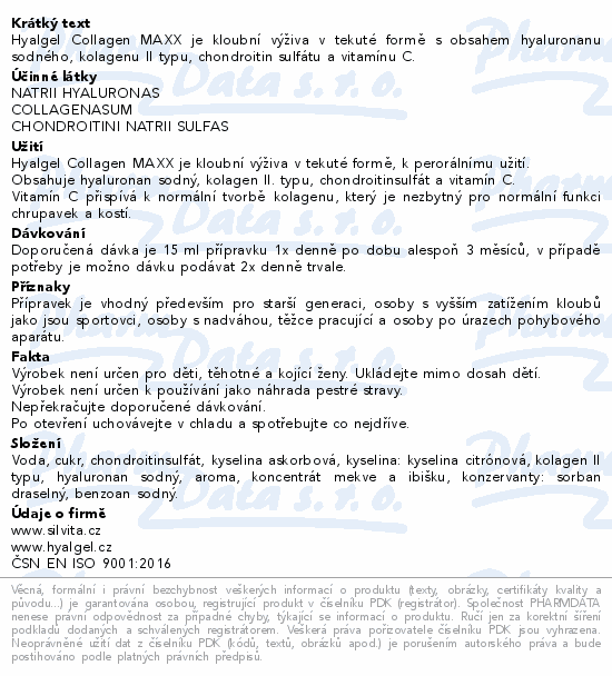 Hyalgel Collagen MAXX je kloubní výživa v tekuté formě s obsahem hyaluronanu sodného, kolagenu II typu, chondroitin sulfátu a vitamínu C.