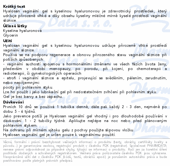 Hyalosan vaginální gel s kyselinou hyaluronovou je zdravotnický prostředek, který udržuje přirozeně vlhké a díky obsahu kyseliny mléčné mírně kyselé prostředí vaginální sliznice.