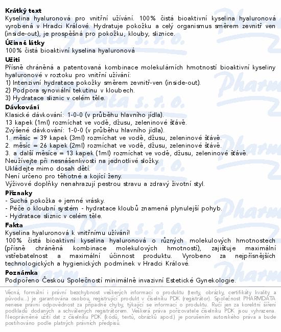 Kyselina hyaluronová pro vnitřní užívání. 100% čistá bioaktivní kyselina hyaluronová vyrobená v Hradci Králové. Hydratuje pokožku a celý organismus směrem zevnitř ven (inside-out), je prospěšná pro pokožku, klouby, sliznice.