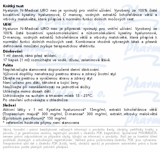 Hyaluron N-Medical URO neo je vyvinutý pro vnitřní užívání. Vyrobený ze 100% čisté bioaktivní kyseliny hyaluronové, D manosy, vodných extraktů lichořeřišnice větší a vrbovky malokvěté, která přispívá k normální funkci dolních močových cest.