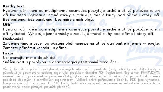 Hyaluron oční krém od medipharma cosmetics poskytuje suché a citlivé pokožce kolem očí hydrataci. Vyhlazuje jemné vrásky a redukuje tmavé kruhy pod očima i otoky očí. Bez parfému, bez parabenů, bez minerálních olejů.