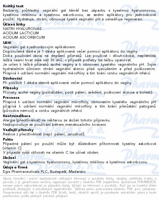 Bezbarvý, průhledný vaginální gel téměř bez zápachu s kyselinou hyaluronovou, kyselinou mléčnou a kyselinou askorbovou, se sedmi aplikátory pro jednorázové použití. Hydratuje, chrání, obnovuje kyselé vaginální pH a usnadňuje regeneraci.