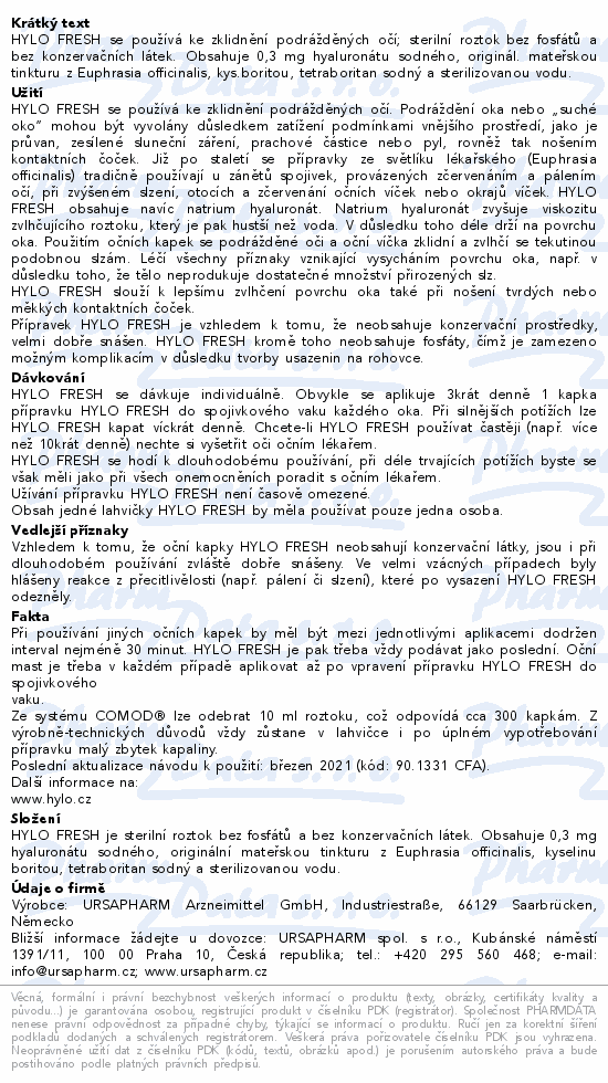 HYLO FRESH se používá ke zklidnění podrážděných očí; sterilní roztok bez fosfátů a bez konzervačních látek. Obsahuje 0,3 mg hyaluronátu sodného, originál. mateřskou tinkturu z Euphrasia officinalis, kys.boritou, tetraboritan sodný a sterilizovanou vodu.