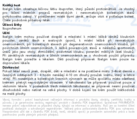 Ibalgin krém obsahuje léčivou látku ibuprofen, který působí protizánětlivě. Je vhodný pro léčení místních projevů revmatických i nerevmatických bolestivých stavů pohybového ústrojí. V postiženém místě tlumí zánět, snižuje otok a potlačuje bolest. Čtěte pozorně příbalový leták.