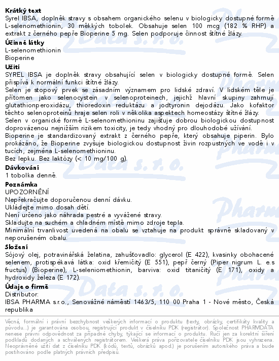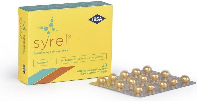 Syrel IBSA, doplněk stravy s obsahem organického selenu v biologicky dostupné formě L-selenomethionin, 30 měkkých tobolek. Obsahuje selen 100 mcg (182 % RHP) a extrakt z černého pepře Bioperine 5 mg. Selen podporuje činnost štítné žlázy.