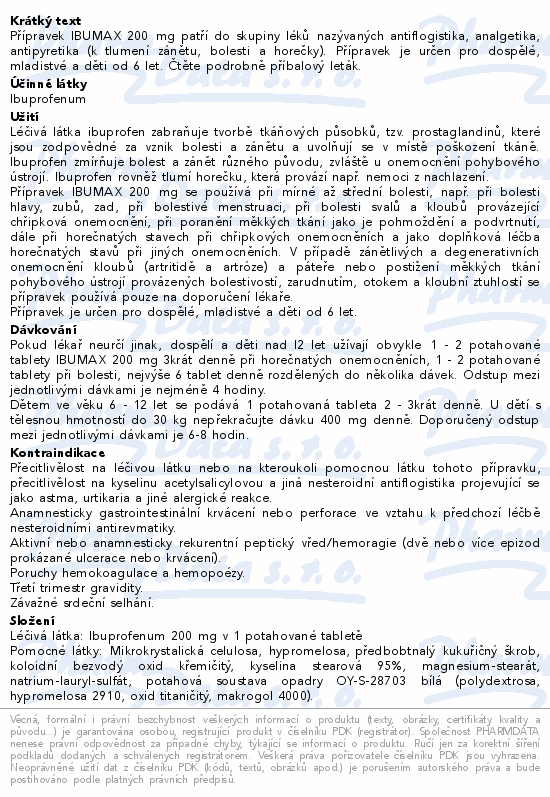 Přípravek IBUMAX 200 mg patří do skupiny léků nazývaných antiflogistika, analgetika, antipyretika (k tlumení zánětu, bolesti a horečky). Přípravek je určen pro dospělé, mladistvé a děti od 6 let. Čtěte pozorně příbalový leták.