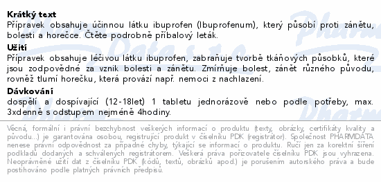 | Farmako-terapeutická skupina, účinné látky: | MUSKULOSKELETÁRNÍ SYSTÉM -> PROTIZÁNĚTLIVÁ A PROTIREVMATICKÁ LÉČIVA -> NESTEROIDNÍ PROTIZÁNĚTLIVÁ A PROTIREVMATICKÁ LÉČIVA -> DERIVÁTY KYSELINY PROPIONOVÉ -> IBUPROFEN |