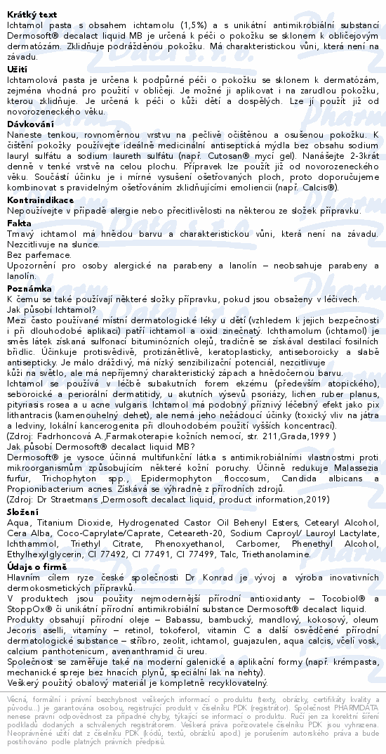 Ichtamol pasta s obsahem ichtamolu (1,5%) a s unikátní antimikrobiální substancí Dermosoft® decalact liquid MB je určená k péči o pokožku se sklonem k obličejovým dermatózám. Zklidňuje podrážděnou pokožku. Má charakteristickou vůni, která není na závadu.