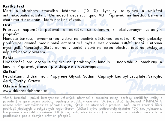 Mast s obsahem tmavého ichtamolu (10 %), kyseliny salicylové a unikátní antimikrobiální substancí Dermosoft decalact liquid MB. Přípravek má hnědou barvu a charakteristickou vůni, která není na závadu.