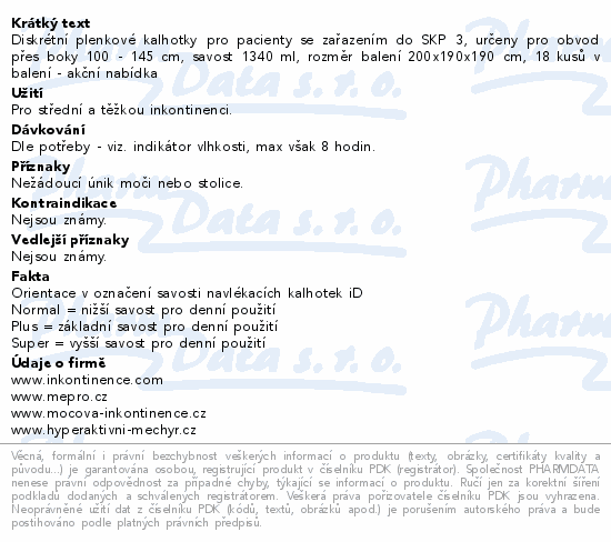 Diskrétní plenkové kalhotky pro pacienty se zařazením do SKP 3, určeny pro obvod přes boky 100 - 145 cm, savost 1340 ml, rozměr balení 200x190x190 cm, 18 kusů v balení - akční nabídka