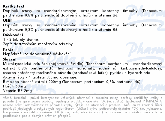 Doplněk stravy se standardizovaným extraktem kopretiny řimbaby (Tanacetum parthenium 0,8% partnenolidů) doplněný o hořčík a vitamin B6.