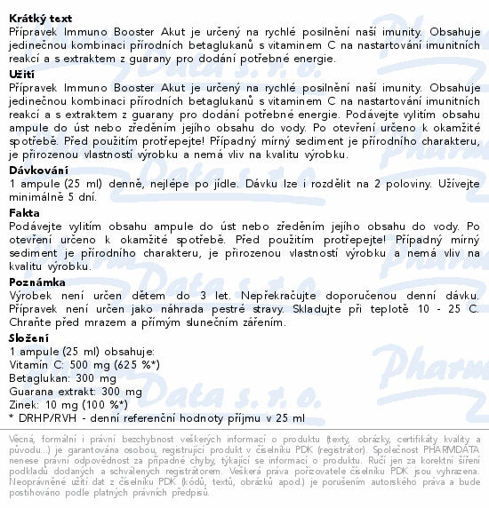 Přípravek Immuno Booster Akut je určený na rychlé posilnění naší imunity. Obsahuje jedinečnou kombinaci přírodních betaglukanů s vitaminem C na nastartování imunitních reakcí a s extraktem z guarany pro dodání potřebné energie.