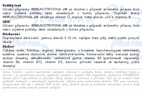 Užívání přípravku IMMUNOTROFINA d® je vhodné v případě sníženého přísunu živin nebo zvýšené potřeby látek obsažených v tomto přípravku. Doplněk stravy IMMUNOTROFINA d® obsahuje vitamin D, arginin, beta-glukan, jód a vitaminy B.