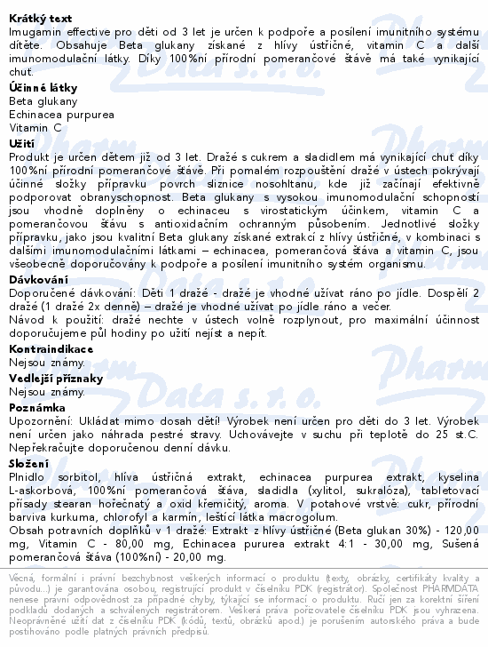Imugamin effective pro děti od 3 let je určen k podpoře a posílení imunitního systému dítěte. Obsahuje Beta glukany získané z hlívy ústřičné, vitamin C a další imunomodulační látky. Díky 100%ní přírodní pomerančové štávě má také vynikající chuť.