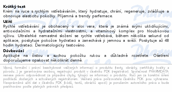 Krém na ruce s rychlým vstřebáváním, který hydratuje, chrání, regeneruje, zvláčňuje a obnovuje elasticitu pokožky. Příjemná a trendy parfemace.