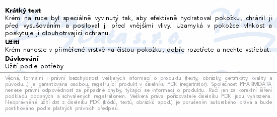 Krém na ruce byl speciálně vyvinutý tak, aby efektivně hydratoval pokožku, chránil ji před vysušováním a posiloval ji před vnějšími vlivy. Uzamyká v pokožce vlhkost a poskytuje jí dlouhotrvající ochranu.
