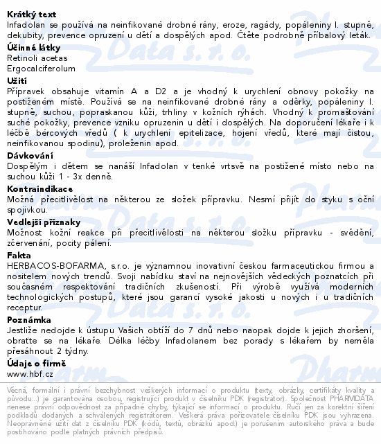 Infadolan se používá na neinfikované drobné rány, eroze, ragády, popáleniny I. stupně, dekubity, prevence opruzení u dětí a dospělých apod. Čtěte pozorně příbalový leták.