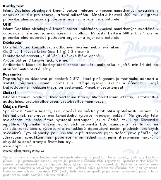 Infant Dophilus obsahuje 6 kmenů bakterií mléčného kvašení namíchaných speciálně v odpovídající síle pro zdravou střevní mikroflóru. Množství bakterií 500 mil. v 1gramu přípravku plně odpovídá potřebám organizmu kojence a batolete.