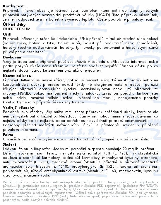 Přípravek Inflanor obsahuje léčivou látku ibuprofen, která patří do skupiny léčivých přípravků nazývaných nesteroidní protizánětlivé léky (NSAID). Tyto přípravky působí tak, že mění odpověď těla na bolest a zvýšenou teplotu. Čtěte pozorně příbalový leták.