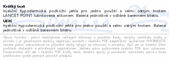 Injekční hypodermická podkožní jehla pro jedno použití s velmi ostrým hrotem LANCET POINT lubrikovaná silikonem. Balená jednotlivě v odlišně barevném blistru.