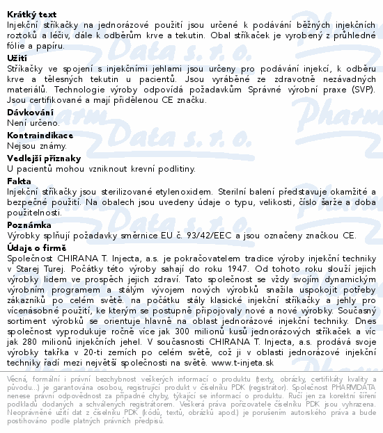 Injekční stříkačky na jednorázové použití jsou určené k podávání běžných injekčních roztoků a léčiv, dále k odběrům krve a tekutin. Obal stříkaček je vyrobený z průhledné fólie a papíru.