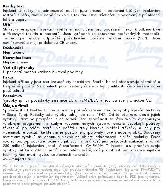 Injekční stříkačky na jednorázové použití jsou určené k podávání běžných injekčních roztoků a léčiv, dále k odběrům krve a tekutin. Obal střekaček je vyrobený z průhledné fólie a papíru.