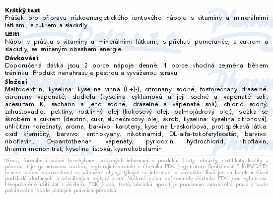 CZ: Nápoj v prášku s vitaminy a minerálními látkami, s příchutí pomeranče, s cukrem a sladidly, se sníženým obsahem energie. Složení: maltodextrin, kyselina: kyselina vinná (L+)-), citronany sodné, fosforečnany draselné, citronany vápenaté, sladidla (kyselina cyklamová a její sodné a vápenaté soli, acesulfam K, sacharin a jeho sodné, draselné a vápenaté soli), chlorid sodný, zahušťovadlo: pektiny, rostlinný olej (kokosový olej, palmojádrový olej), složka se škrobem a cukrem (dextrin, cukr, slunečnicový olej, škrob, kyselina: kyselina citronová), uhličitan hořečnatý, aroma, barvivo: karoteny, kyselina L-askorbová, protispékavá látka: oxid křemičitý, barvivo: anthokyany, nikotinamid, DL-alfa-tokoferylacetát, barvivo: riboflavin, D-pantothenan vápenatý, pyridoxin hydrochlorid, riboflavin, thiamin-mononitrát, kyselina listová, kyanokobalamin. Příprava: Na přípravu 1 porce smíchejte 1 odměrku (16,5 g) s 500 ml vody. Doporučené dávkování: 2 porce nápoje denně. 1 porce vhodná zejména během tréninku. Produkt nenahrazuje pestrou a vyváženou stravu. Skladujte v suchu, chraňte před teplem. Minimální trvanlivost do konce: viz spodní strana obalu. Vyrobeno v Německu.