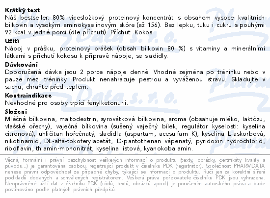 Náš bestseller. 80% vícesložkový proteinový koncentrát s obsahem vysoce kvalitních bílkovin a vysokým aminokyselinovým skóre (až 156). Bez lepku, tuku i cukru s pouhými 92 kcal v jedné porci (dle příchuti).